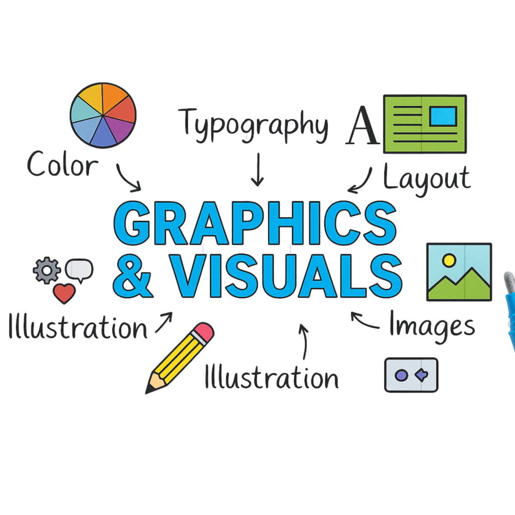 GRAPHICS & VISUALS What are Graphics & Visuals? Creative designs that make your brand stand out. Used in posts, ads, and marketing materials. What We Provide: Social media creatives Ad banners & posters Infographics & illustrations Custom brand visuals